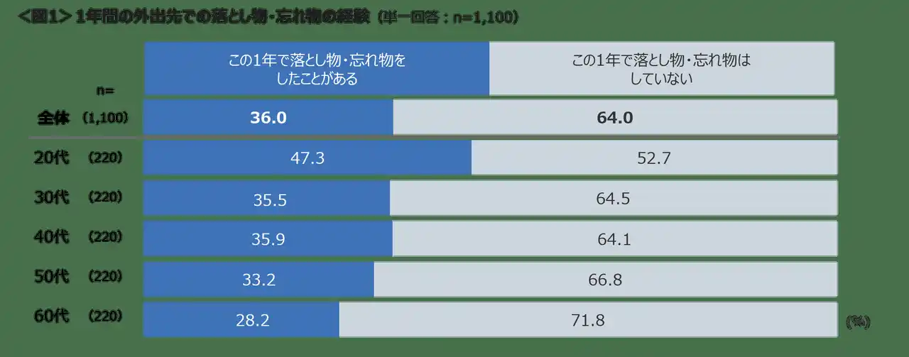 株式会社クロス・マーケティング(本社:東京都新宿区、代表取締役社長兼CEO:五十嵐 幹)は、全国20歳~69歳の男女を対象に「落とし物・忘れ物に関する調査(2026年)」を実施しました。日常生活の中で、スマートフォンや鍵、イヤホンなどをうっかり落としたり置き忘れてしまった、落とし物を見つけてしまった経験は誰しもあるのではないでしょうか。今回は、この1年間の外出先での落とし物・忘れ物の経験と落としたもの、落としたと気づいた際にとる行動、落とし物を防ぐための工夫や印象的なエピソードについて聴取しました。 *落とし物・忘れ物…外出先などで持ち物を「落とす」または「置き忘れる」で聴取(出かける際に家に忘れてきた経験は除く) |