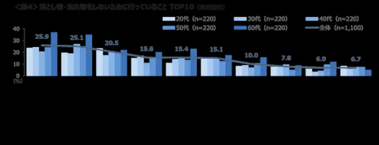 落とし物・忘れ物を防ぐための対策は、「移動時や席を立つときに持ち物を確認」「持ち物の定位置を決める」「できるだけ持ち物を減らす」が2割台。 60代は「持ち物の確認」「持ち物は定位置へ」「ファスナー付きのポケットやカバンの利用」が高く、日頃の工夫が見受けられた。<図4> |