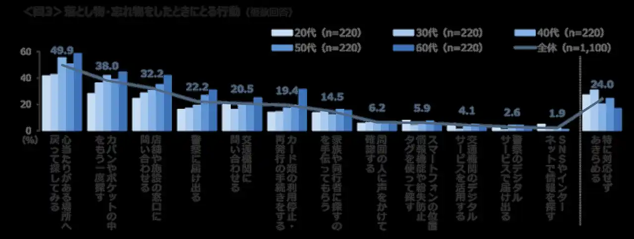 何かを落とした時の行動として、「心当たりがある場所へ戻って探してみる」「カバンやポケットの中をもう一度探す」「店頭や施設の窓口に問い合わせる」がTOP3。 年代が高いほど、探す・問い合わせる行動が多い。20~30代は、落としても「特に対応せずあきらめる」が3割前後と高い。<図3> |