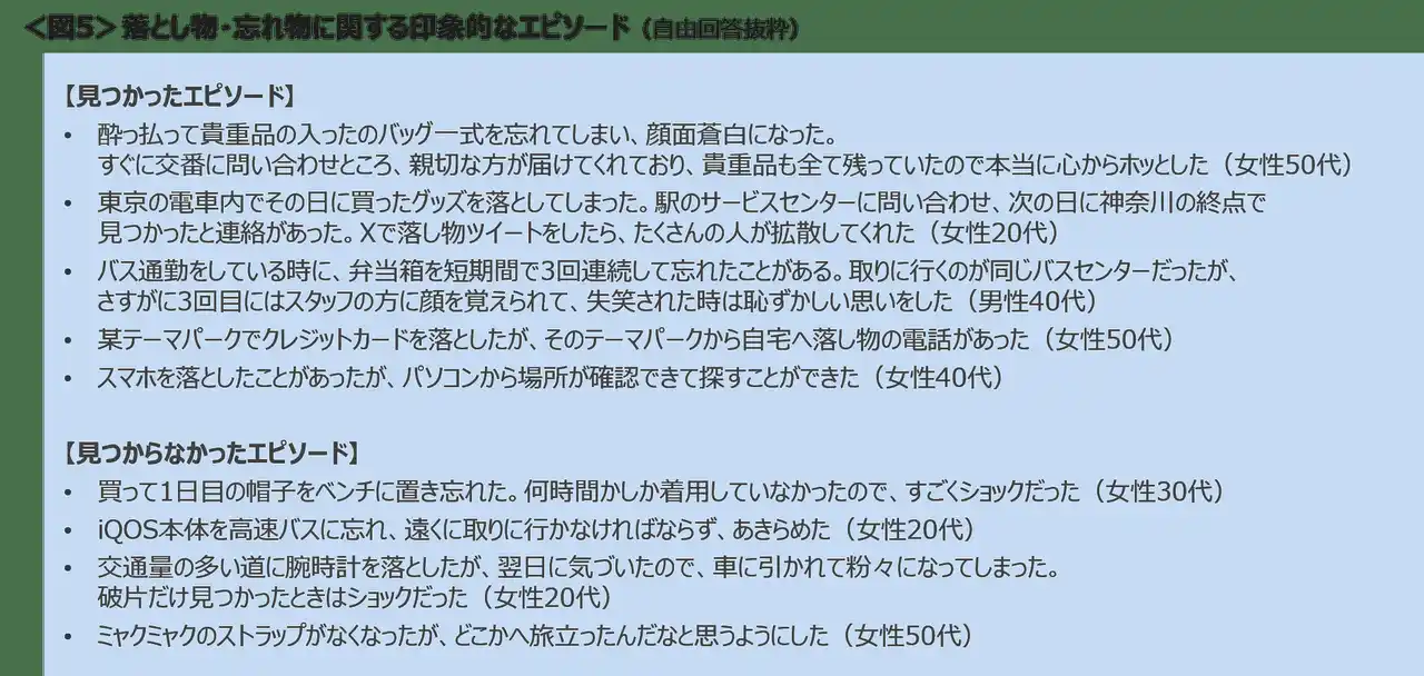貴重品やカードの落とし物などは交番や交通機関などで、スマートフォンは位置情報で見つかり安堵したケースや購入してから日がたっていないもの、落として破片と化したものなどショックを受けたという話が聞かれた。<図5> |