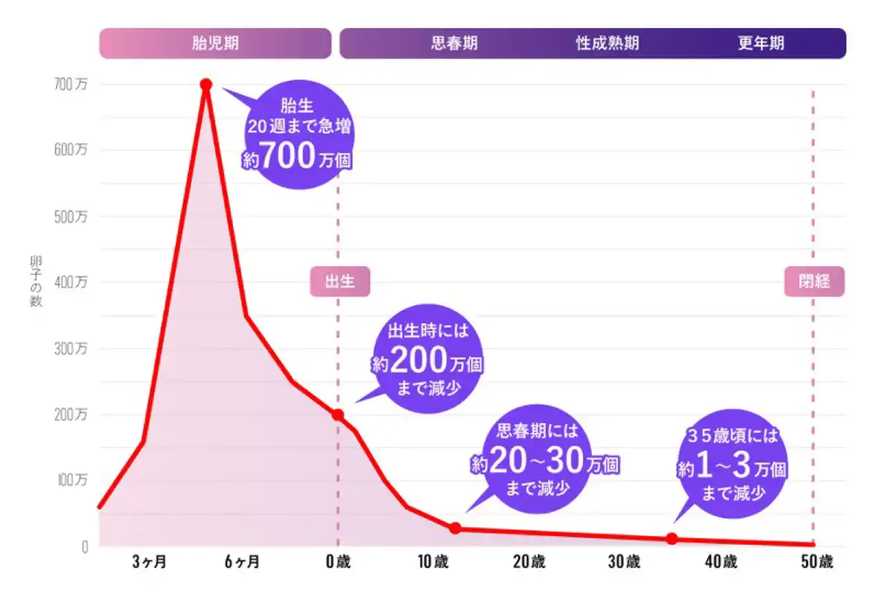 こうした中、両者に直面する最大の壁は、年齢に伴う「卵子の数」と「妊娠力」の不可逆的な低下です。胎児期に約700万個あった卵子は、出生時、思春期を経て減少を続け、35歳頃には約1~3万個にまで激減します。※4 日本では現在、約9人に1人が体外受精によって誕生していますが、※5 自己卵子による体外受精の出産率は35歳を境に急減する傾向にあります。※6「不妊治療」が一般化する一方で、治療が必要になる前の段階で自身の心身の状態を正しく把握し、将来の妊娠に備えて生活習慣を整える「プレコンセプションケア(妊娠前の健康管理)」の普及は、いまや社会全体の急務となっています。 |