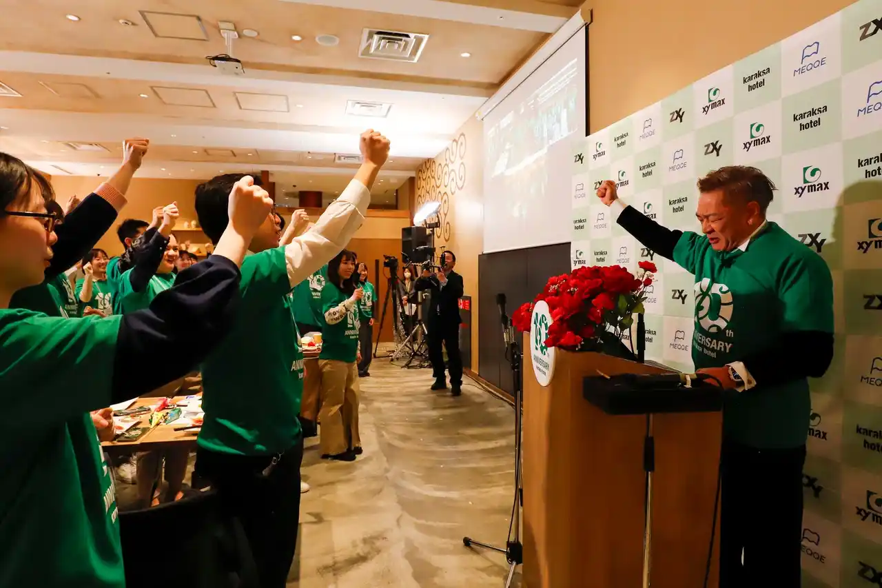 第一弾として、記念ロゴを発表し、3月18日には記念宿泊プランを販売開始するとともに、大阪・東京・札幌の3拠点をライブ配信で結ぶ社内イベントを開催しました。