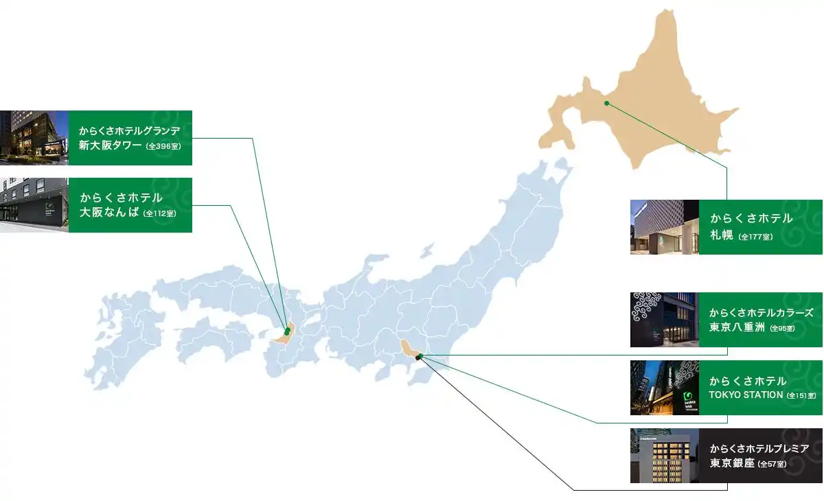 からくさホテルは札幌に1軒、東京に3軒、大阪に2軒の計6ホテルを展開 |