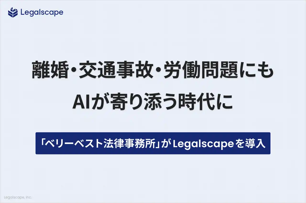 株式会社Legalscape(本社:東京都文京区、代表取締役社長・最高経営責任者:八木田 樹、以下リーガルスケープ)が提供するリーガルリサーチプラットフォーム「Legalscape(リーガルスケープ)」は、このたび、全国規模で一般民事事件を中心に幅広い分野を取り扱う大手法律事務所「ベリーベスト法律事務所」(東京オフィス:東京都港区、代表弁護士:酒井 将)に導入されました。