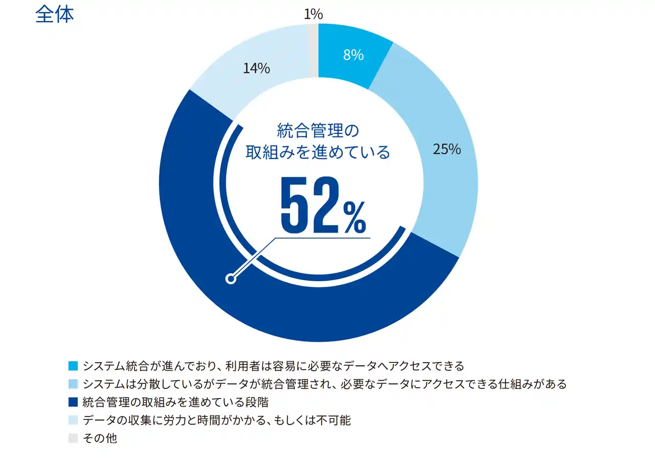 また、「データへのアクセスのしやすさ」への回答は、52%が「統合管理の取り組みを進めている」であり、14%が「データの収集に労力と時間がかかる、もしくは不可能」と回答。 |
