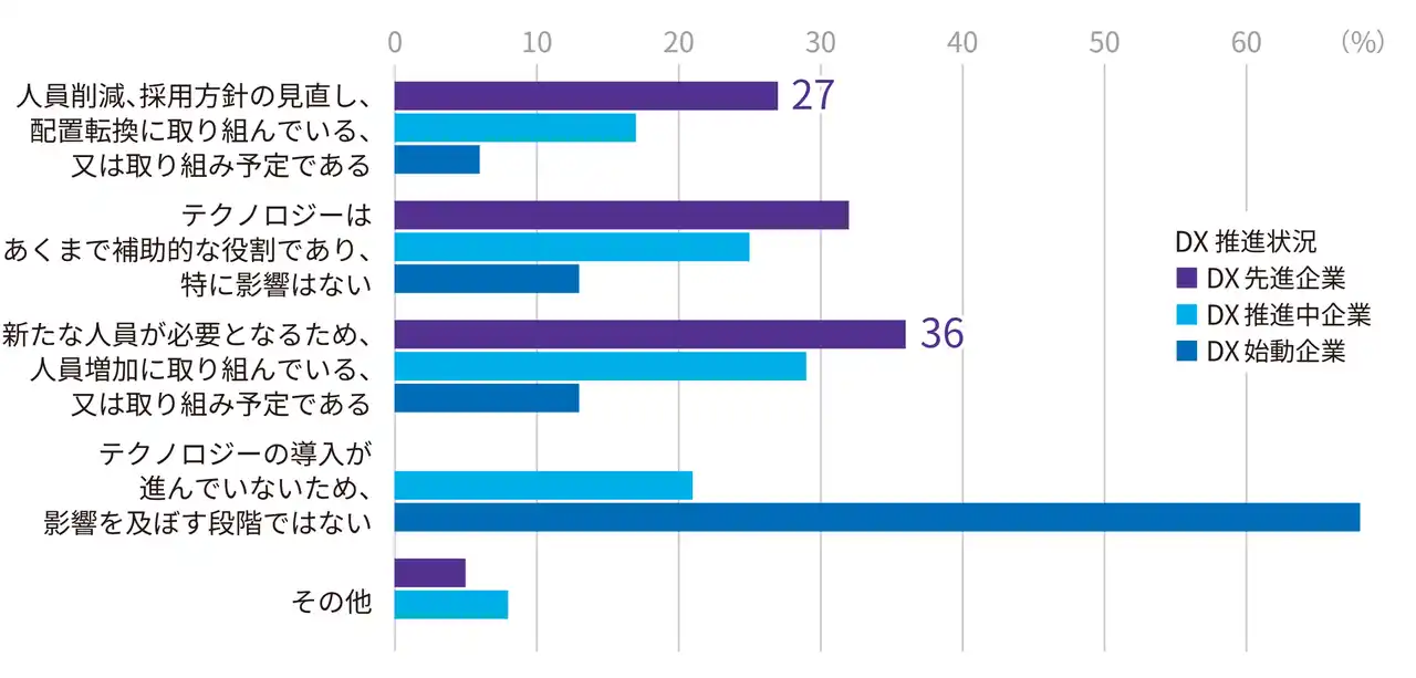 3.「AIによる人材戦略への影響」について、DX先進企業で最も多かった回答は、「新たな人員が必要となるため、人員増加に取り組んでいる」であり、「人員削減、採用方針の見直し、配置転換」を上回った。人の担ってきた業務の一部がAI へシフトすることは避けられないが、AIを活用してビジネス価値を創出できる人材の重要性が一層高まっている。 |