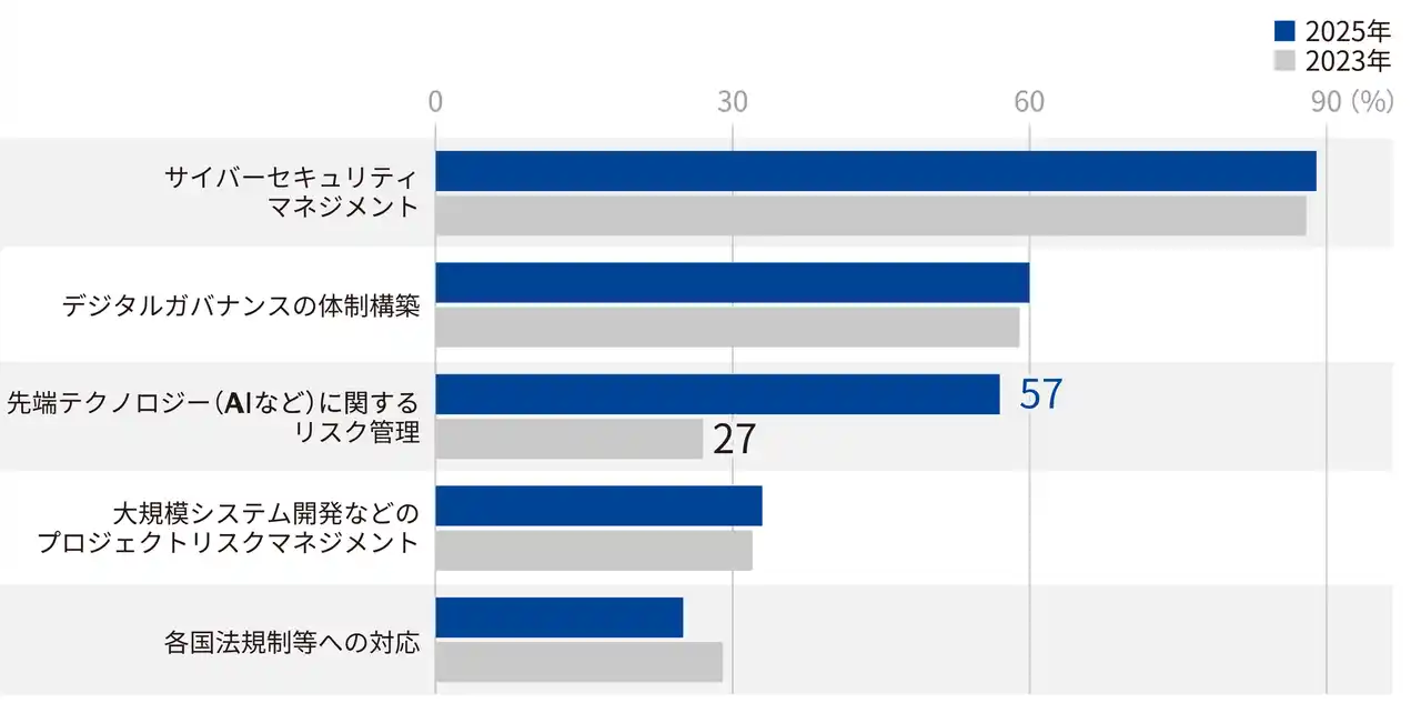 さらに、「デジタル人材に求められるスキルのうち、不足しているもの」への回答は、今回も「ビジネスアーキテクト」が最多となった。これは「AI人材」を上回っており、ビジネスとデジタルテクノロジーを橋渡しする高度な人材の育成が、依然として難易度の高い課題であることを示唆している。 |