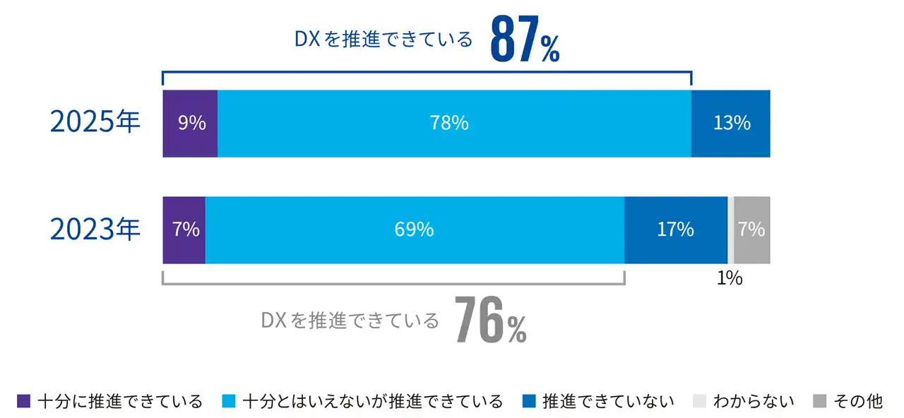生成AIが広がりを見せ始めた2023年の調査から2年が経過し、DXは「導入」段階を経て、「成果創出」や「再現可能性」が問われるフェーズへと移行しています。今回の調査では、「DXを推進できていない」と回答した企業は13%にとどまる一方で、「十分な成果を創出できている」と回答した企業(以下、DX先進企業)は、わずか9%でした。全社展開の停滞、PoC止まり、人材・ガバナンス・データ基盤の未整備といった構造課題が重なり、DX/AIが企業価値へ結実する過程において、「成果創出の壁」が顕在化していることが明らかになっています。 |