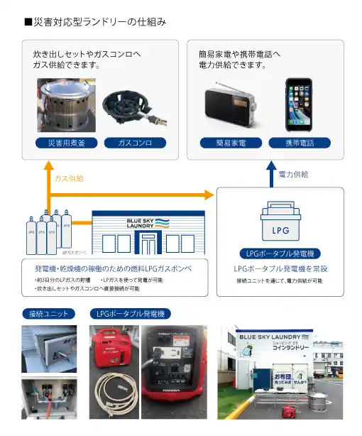ジーアイビーでは、日常の生活に役立つコインランドリーが、災害時には地域支援に活用できるよう、必要な設備を備えた「災害対応型ランドリー」として整備しています。 |