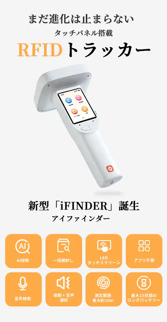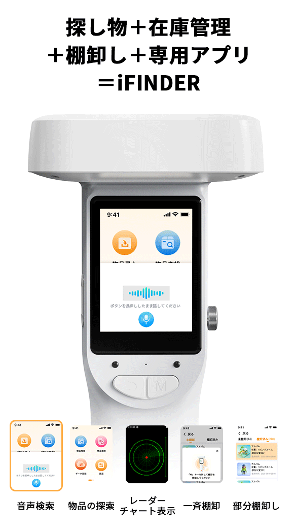 日常のほとんどの場面で、iFINDERはスマートフォン用アプリを必要とせず、タッチスクリーン操作だけで、物品の探索、管理、棚卸しをスムーズに行えます。AI補助アルゴリズムによる探索補助により、約10mの範囲での探し物をサポートし、棚のどの段にあるかまで正確に確認できます。レーダーチャート・音声・振動による通知で、目的の物へと的確に導きます。家庭でも、オフィスでも、倉庫でも。iFINDERが物品管理をすっきりと整理し、探し物に時間を取られる日常から解放します。 |