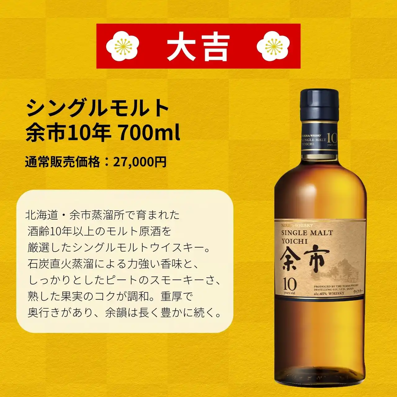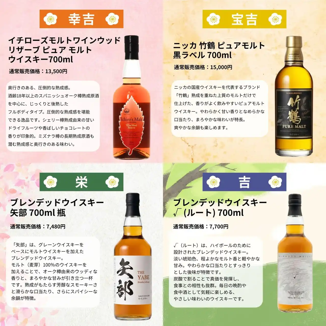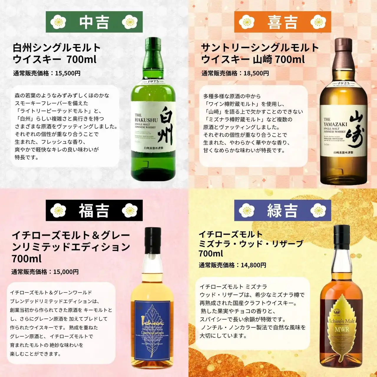 ・[超大吉×1]竹鶴25年 ピュアモルト ・[大大吉×3]山崎12年 ・[大吉×3]余市10年 ・[中吉×5]白州シングルモルト ・[喜吉×5]山崎シングルモルト ・[福吉×5]イチローズモルト&グレーンリミテッドエディション ・[緑吉×10]イチローズモルト ミズナラ・ウッド・リザーブ ・[幸吉×10]イチローズモルトワインウッドリザーブ ピュア モルト ・[宝吉×10]竹鶴 ピュアモルト 黒ラベル |