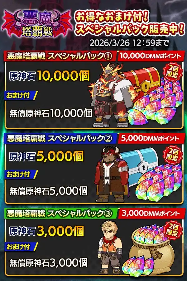 2回購入限定のお得な原神石が入手可能な「悪魔塔覇戦スペシャルパック」が3種登場! また、「グルガーズ」と「エフタ」の育成に役立つアイテムがおまけに付いた1回購入限定の育成促進パックがそれぞれ登場! 期間限定販売のお得な機会をお見逃しなく! |