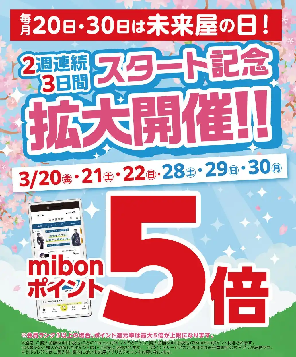株式会社未来屋書店(本社:千葉県千葉市美浜区、代表取締役社長:平川雅隆、以下 未来屋書店)は、2026 年3 月より、毎月 20 日・30 日を「未来屋の日」と制定いたしました。未来屋書店公式アプリ(以下 アプリ)会員のお 客さまを対象に mibon ポイント5倍サービスを開始いたします。 開始月となる 2026 年3月は、20 日・30 日が週末にあたることから、スタート記念として対象日を拡大し、2週 連続・計6日間のキャンペーンとして実施いたします。 |