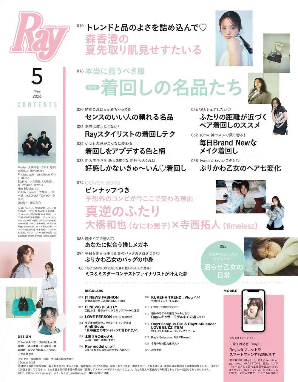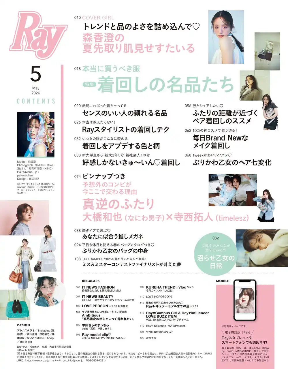 2026年3月23日(月)に発売する2026年5月号の通常版表紙は森香澄さん、特別版表紙は大橋和也さん(なにわ男子)と寺西拓人さん(timelesz)がそれぞれ務めます。今号の大特集テーマは「本当に買うべき服 着回しの名品たち」。憧れガールが指名する名品アイテムや彼とシェアするペア着回し、コスメ着回しなど、アイテム選びや組み合わせ方でガラリと印象が変わる着回しテクニックについて、押さえておきたいポイントやコツをたっぷりとご紹介します。 |