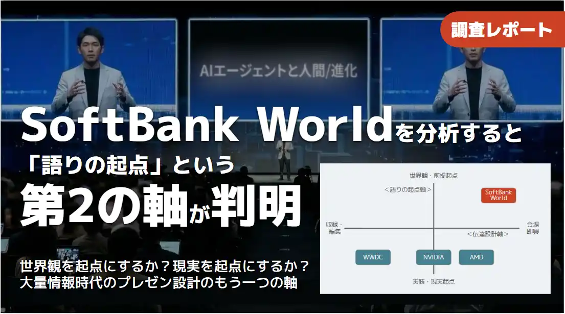 既報では、大量情報時代の届け方を、「ライブの即興」と「収録のコンテンツ化」という2系統として整理しました。一方、今回のSoftBank World年代比較では、同じライブ形式でも、ストーリーの入口としての起点話題が「世界観起点」か「目標起点」かによって、スピーチ全体で何に焦点を置くか、何を先に共有するかが異なってくることが示唆されました。(※本稿でいう「目標起点」とは、達成したい未来像つまり目標を先に置き、そこから必要な技術・実装へ逆算して語りを展開する構成を指します。) |