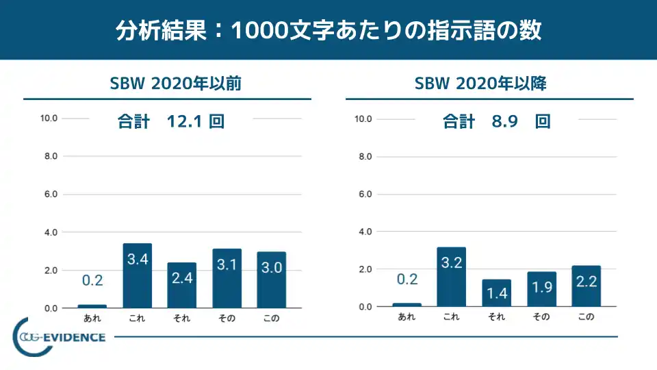 話量(文字数)は、2020年以前の平均が 18,183文字、2020年以降の平均が 8,772文字 と大きく減少しました(話量比較)。また、1000文字あたりの指示語数も、2020年以前 合計12.1回 に対し、2020年以降 合計8.9回 と減少しています。 |