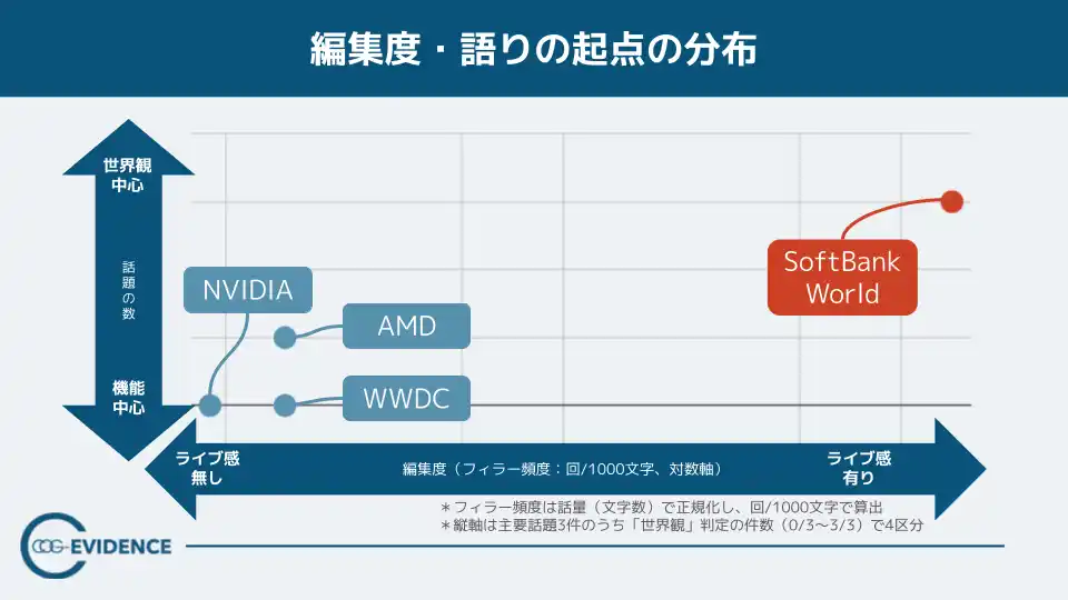 【読み取れること】SBWは、世界観寄り × ライブ感あり(ライブ感が出る/フィラー頻度が高い)の領域に位置し、他のキーノート群とは異なるポジションとなっている。一方で、WWDCおよびNVIDIAは、相対的に機能寄り × ライブ感なしにまとまっており、「大量情報を崩さず届け切る」側の設計に寄った配置になっている。 |