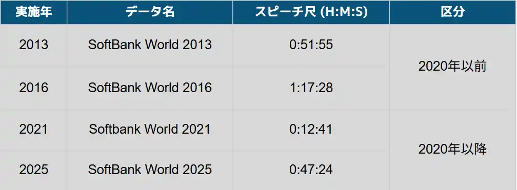 本分析では、SoftBank Worldにおける孫正義氏のスピーチ(2013年・2016年・2021年・2025年の計4本)を対象に、2020年前後で区分して比較しました(総量189分、最長:2016年、最短:2021年)。 |