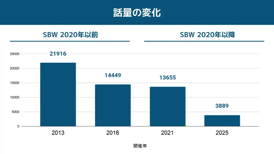 【読み取れること】WWDC2020(単年)が最速(高密度)である一方、SBW(2013-16/2021-25)はいずれもアナウンサー平均を下回り、CES/WWDCより低速側に位置する。 |