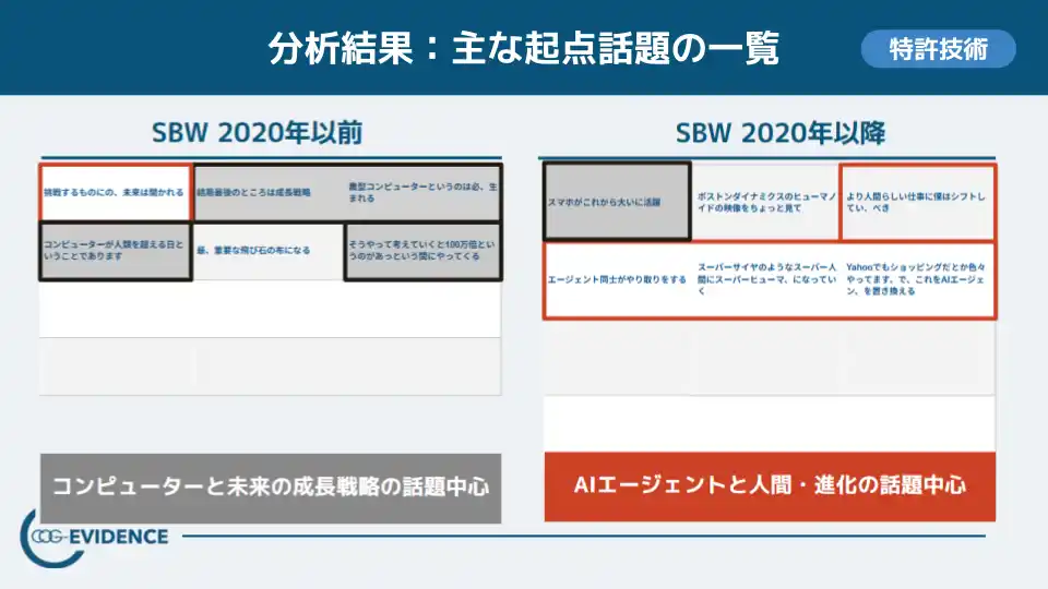■ 主な結果2.:起点話題は「コンピューターと成長戦略」から「AIエージェントと人間・進化」へ |