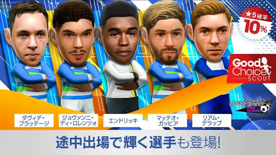 好評配信中のスポーツ育成シミュレーションゲーム『プロサッカークラブをつくろう! ロード・トゥ・ワールド』(以下 サカつくRTW)では、2026年3月18日(水)より、欧州各国強豪クラブの現役選手が新★5選手として登場する“グッドチョイスSCOUT”を開催します。 |