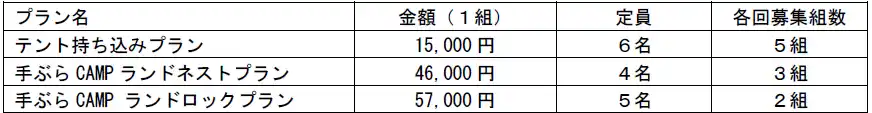 ※上記金額に食材は含まれておりませんので各自お持ち込みください。 ※手ぶらキャンププランの備品詳細は以下サイト内「手ぶらCAMPレンタル品内容」をご確認ください。 |