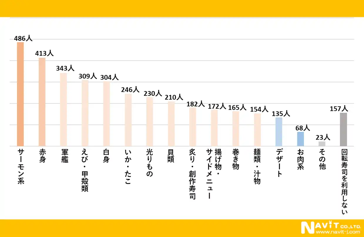 | 「回転寿司でよく注文するメニューのジャンルはどれですか?」という質問を複数選択可で行ったところ、「サーモン系」が486人、「赤身」が413人、「軍艦」が343人と続きました。サーモン系が人気のようです。 | |||