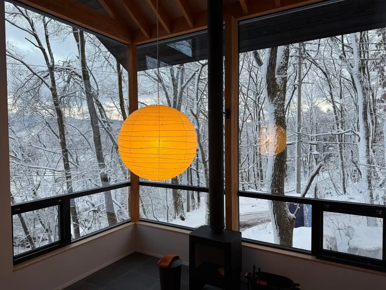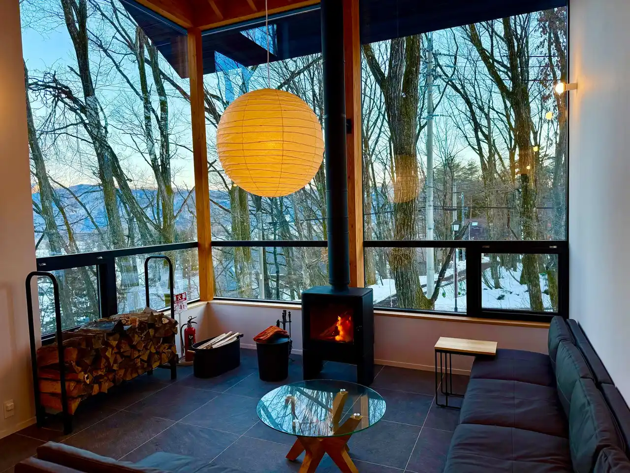 | 石調のタイルのリビングには本格的な薪ストーブを完備。優しくゆらめく炎と、薪がパチパチとはじける音で自然のぬくもりと癒しを体感してください。冬の夜をゆったりと過ごす、そんな特別な時間をお楽しみいただけます。 | |||