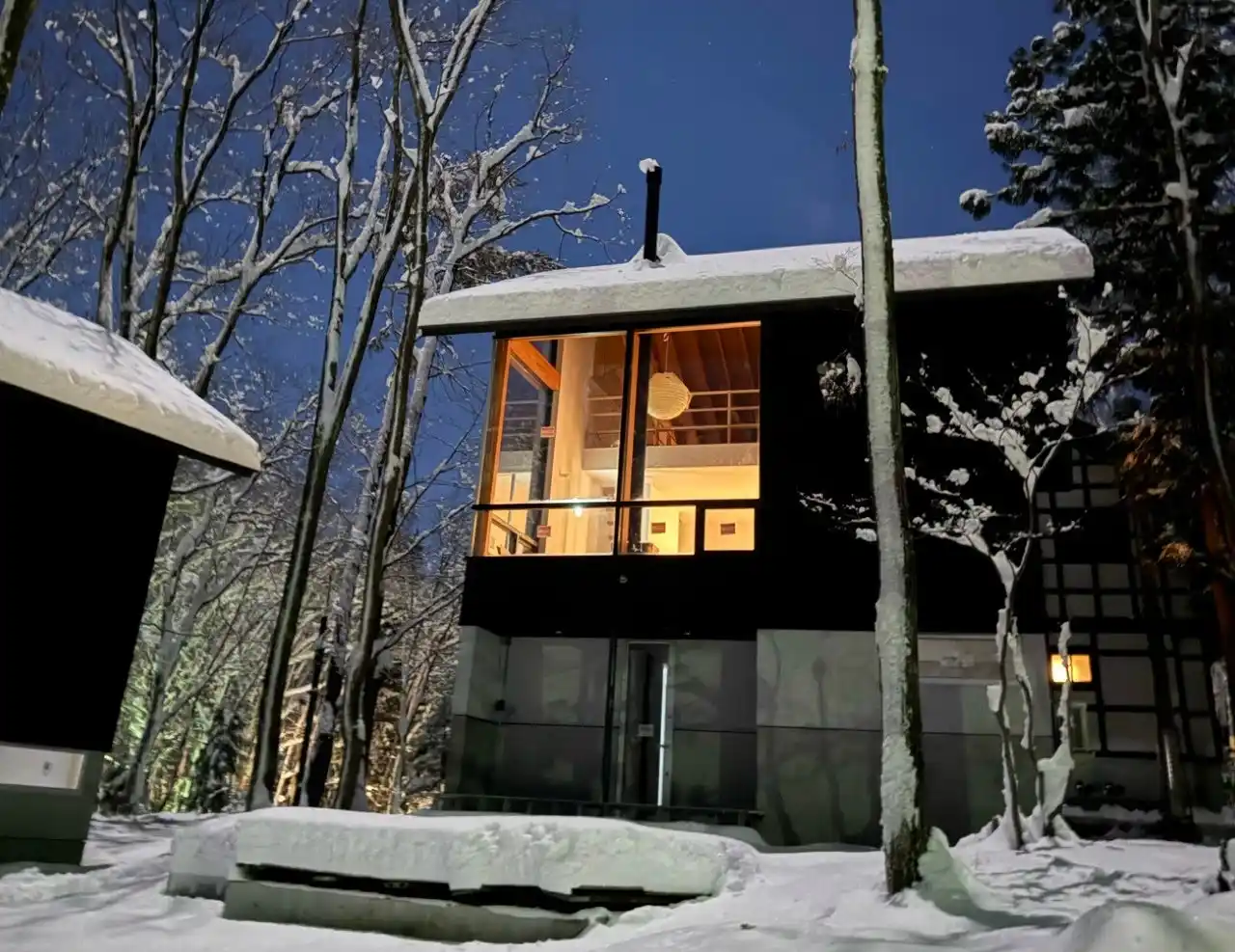 | 白馬の大自然が見渡せる吹き抜けリビングの大開口、サウナや薪ストーブを備えたプライベートシャレーで過ごす非日常 |