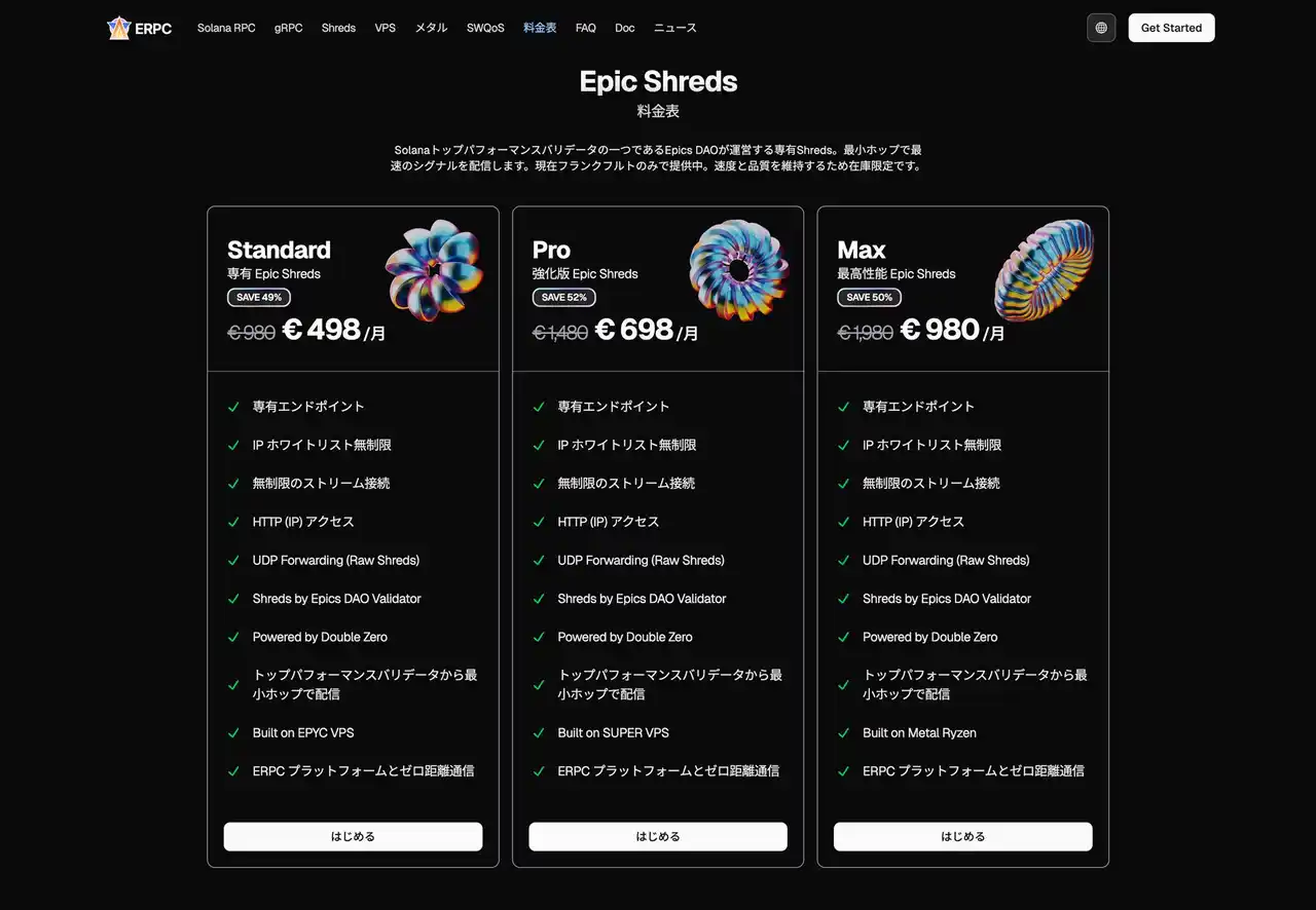 Connect は従来通り Fastest Jito Shreds を提供する共有ストリームです。Turbo は、DoubleZero に接続され、プレミアム帯のハードウェアで運用されるハイパフォーマンスな Epics DAO バリデータが配信する Epic Shreds を、共有形態で利用できるプランです。専有版と同じ配信元を基盤としながら、よりアクセスしやすい価格帯で提供します。 |