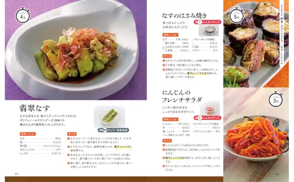 Part0:レンチン料理のルールとテクニック Part1:肉のおかず Part2:魚介のおかず Part3:野菜・きのこのおかず Part4:卵・豆腐・乾物のおかず Part5:ごはん・めん Part6:スープ・汁 Part7:デザート・パン |