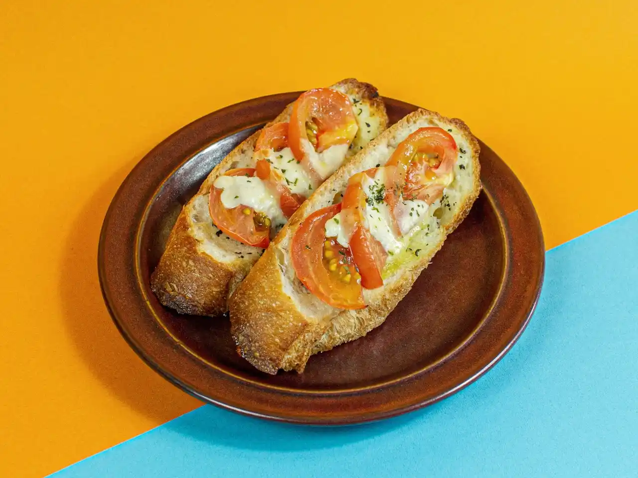 フランスパンにガーリックバターを塗り、トマトとチーズをのせて焼き上げたタルティーヌです。 |