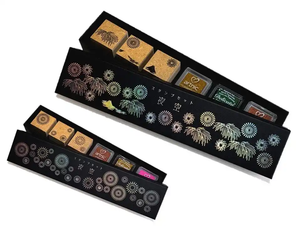 セットされているガイドを使って、まるで浮世絵のようにスタンプを重ねて、あなただけの花火を咲かせることができます。箔押しが輝く豪華なボックスには、花火のスタンプ3種と、黒い紙に映えるインクパッド3色をセット。「しだれ花火」と「大輪の花火」の2種のセットをご用意しています。夏のお手紙や思い出作りに、また海外の方へのお土産にもぴったりです。 |