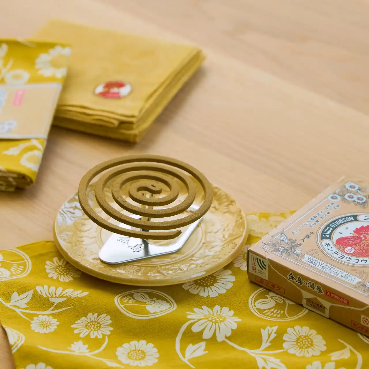 天然除虫菊の金鳥の渦巻と、瀬戸焼の線香皿を半分サイズの菊染めした手ぬぐいで巻き、紙帯を巻いたセットです。キャッチーな見た目なので贈り物としてもおすすめです。 |