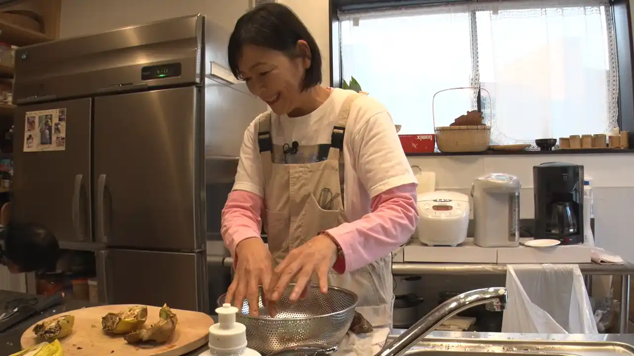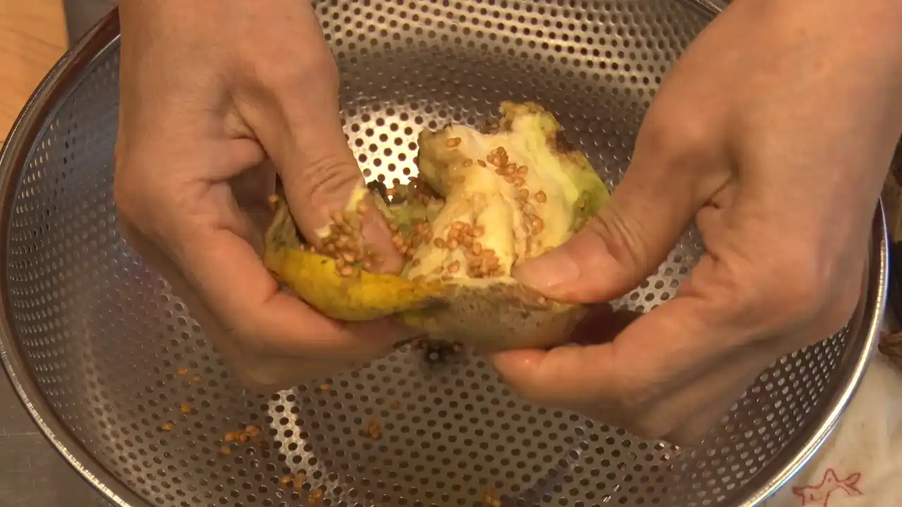 部屋の中で何やら黙々と作業をしているなおみさん、良く見てみると手にはナスが…大分在来種プロジェクトとして、モチトウキビや宗麟南瓜と共に、一生懸命育てた白ナスです。この日は来年に向けた種取り作業をするとのこと!色こそ白いものの、姿カタチは私たちにもお馴染みの見慣れたナス。一体このナスからどのようにして種を作り出すのでしょうか…? |