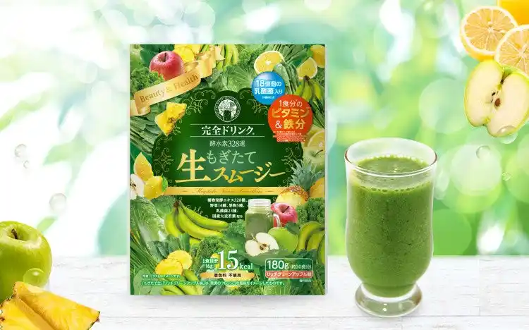 「完全ドリンク酵水素328選もぎたて生スムージー(リッチグリーンアップル味)」は、置き換え習慣をサポートする粉末タイプのスムージーです。 |
