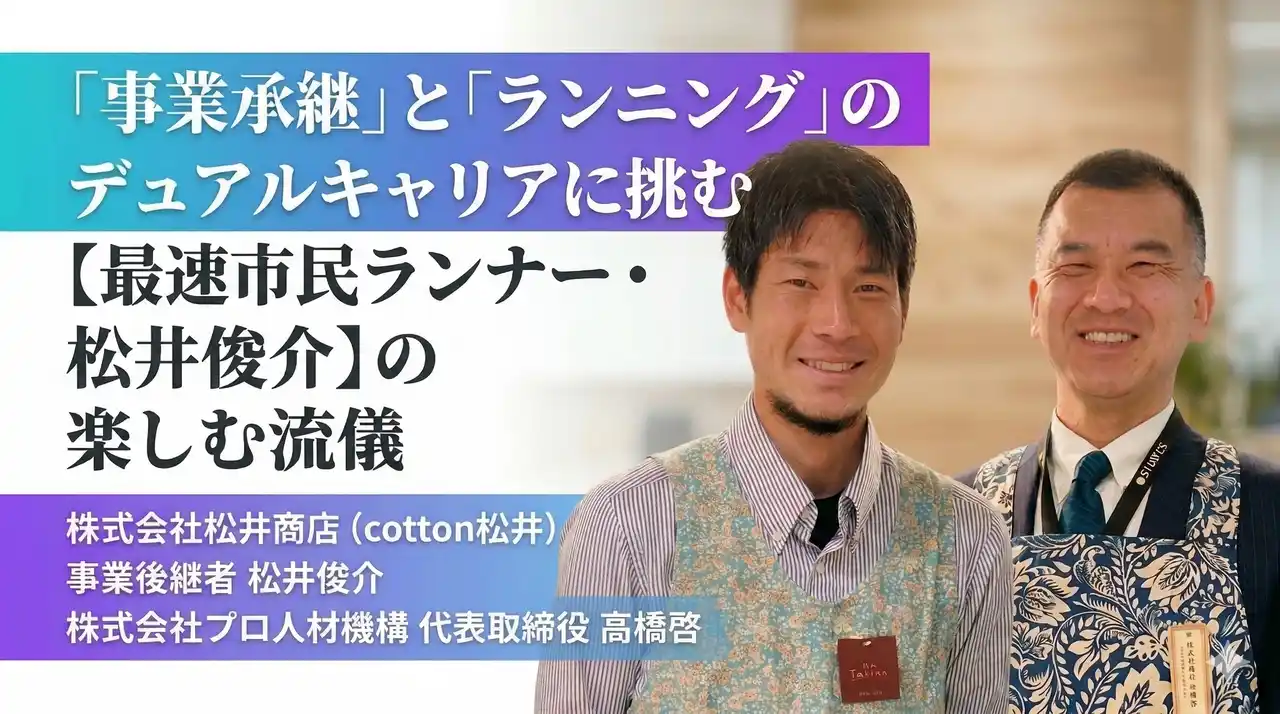 「当社が今後注力する『地方事業承継×シニア経営人材』の領域において、松井選手はまさに象徴的な存在です。彼が取締役を務める株式会社松井商店は、大正から続く伝統を守りながら、独自の染色技術を武器にお客様のライフスタイルに合わせた製品を届けています。松井選手との出会いは皇居ランニングイベントでしたが、単に速さを競うだけでなく、競技を心から楽しむ姿勢に感銘を受けました。『100年続く伝統を背負う重圧』を、走る喜びへと変えて突き進む姿は、地方の優良企業の次世代を担う後継者や、そこに知見を注入するプロ人材にとって、大きな希望となると確信しています。彼のような『進撃する次世代リーダー』を支援することで、日本中の事業承継にポジティブな光を当てたいと考えています。」 |
