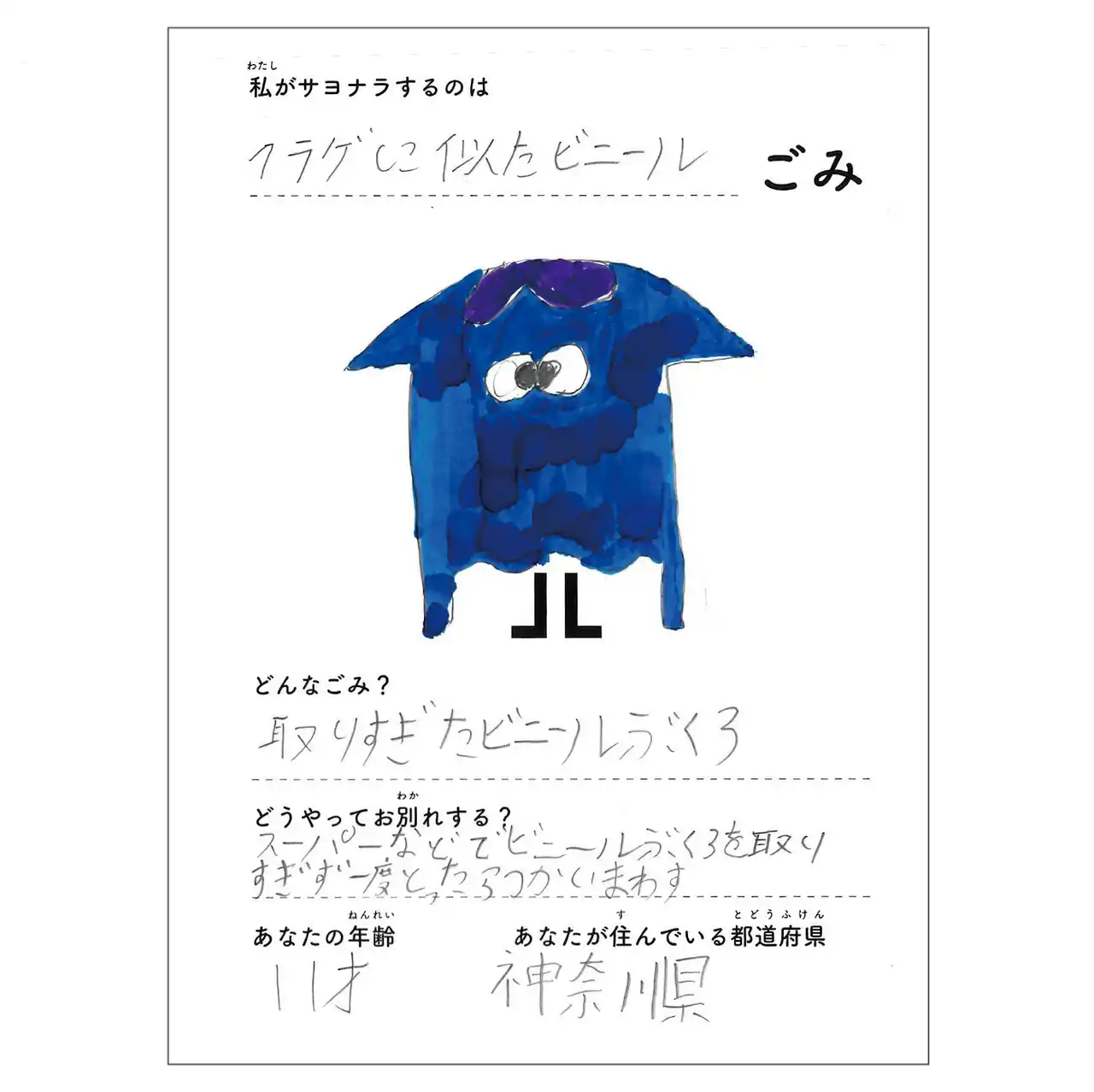 選評: プラスチックは安価で便利な素材で、私たちの生活に欠かせないものです。一方で、なんとなく使ってしまっている場面も多いものですよね。使う時にはしっかり使う、つくったものは大切に使う、いらないときには使わない。そんなひとりひとりの行動が、海ごみの抑制につながるといいですね!大賞、おめでとうございます。 |