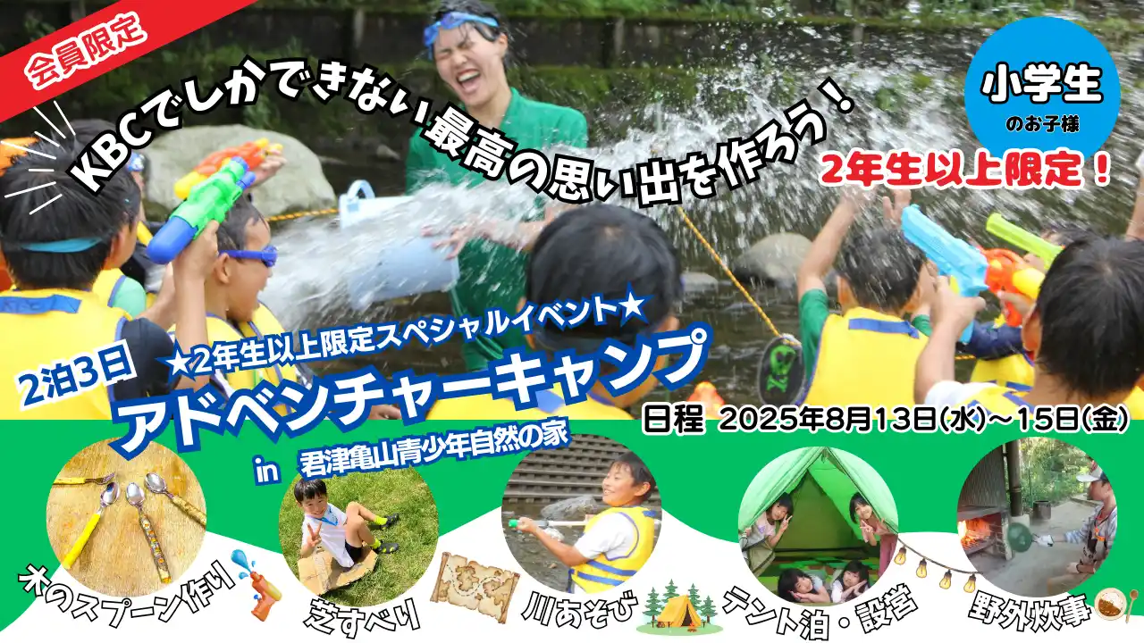 2. KBC初開催!アドベンチャーキャンプ 「もっと冒険したい!挑戦したい!」という声に応え、2年生以上・人数限定でアドベンチャーキャンプを初開催します。テント設営など食事も就寝場所も「自分たちでつくる」体験が詰まったプログラムで、生きる力を養い、主体性や協調性、危険回避能力や判断力などの形成を目指します。夏らしい川遊びや森の探検に出かけ、気に入った枝を使いオリジナルスプーン作りも行います。 |