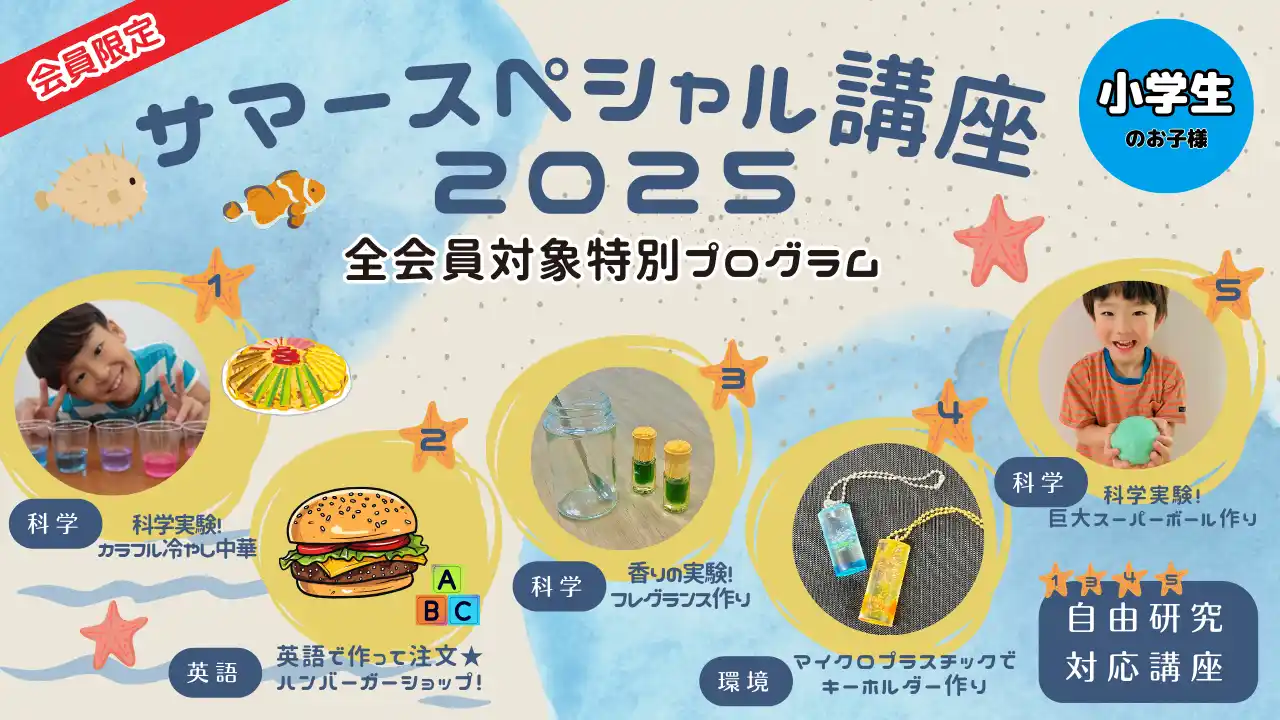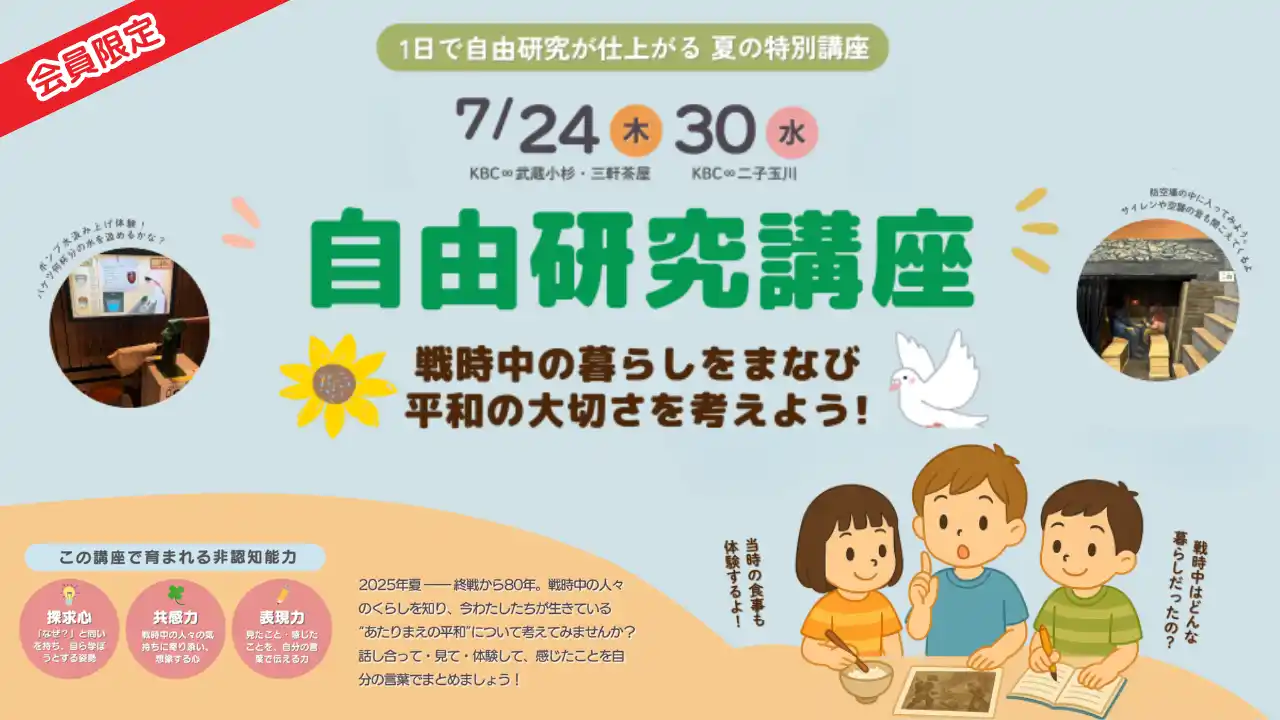 また、東京ドームの裏側見学、銀行員体験、新聞記者体験、保育士体験、芸術鑑賞、電車の車両工場見学など、本物に触れ、プロから学ぶ毎年大人気の職業体験型イベントや、終戦80年のこの夏に「戦争と平和」をテーマにした講座や科学実験とクッキングを組み合わせたワークショップなど、自由研究として小学校に提出可能な成果物を持ち帰ることができるプログラムを企画しております。 |