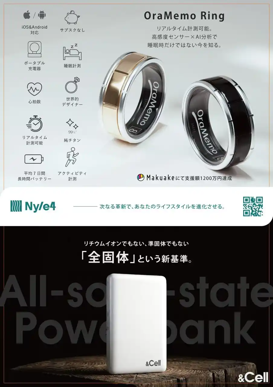 同社は2025年11月、純チタン削り出しのスマートリング 「OraMemo Ring(オラメモリング)」 を応援購入サイトMakuakeにて先行販売し、支援総額1,200万円以上を達成しました。 |