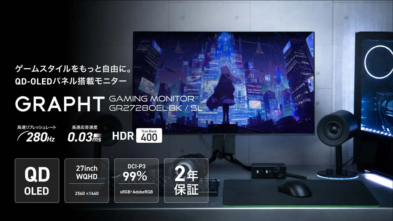 この度、毎日の当たり前をアップデートする『GRAPHT STANDARD』シリーズより、QD-OLEDパネル搭載ゲーミングモニター『GR2728OEL-BK』を2026年3月27日(金)にGRAPHT公式ECサイト(GRAPHT OFFICIAL STORE)およびAmazonにて発売いたします。 |