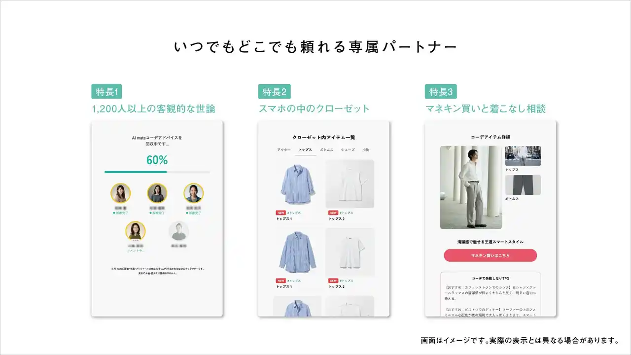 1200人のAIが「世論」を代弁:単一のAIではなく、多様な視点を持つ1200人のAIキャラクター(AI mate)から、ターゲットのタイプ(キレイめ、カジュアル等)や行く場所(TPO)に合わせて最適な5人が選出され、10点満点で総合評価を出します。 |
