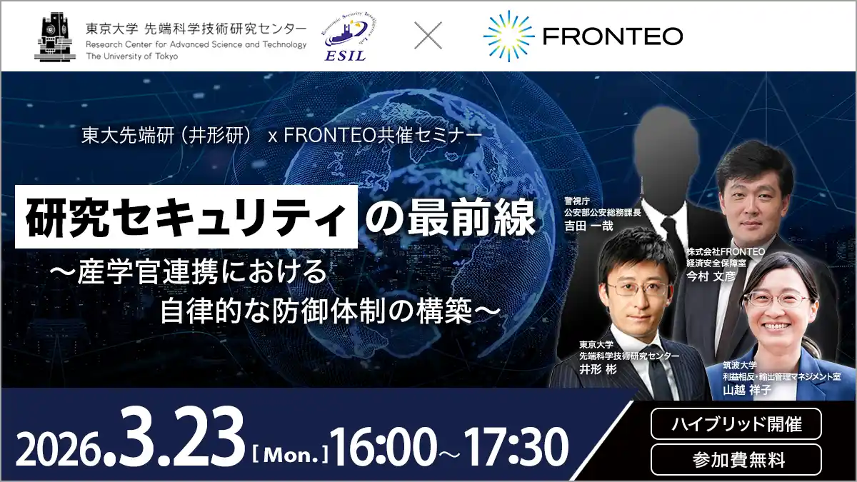 株式会社FRONTEO(本社:東京都港区、代表取締役社長:守本 正宏、以下「FRONTEO」)は、東京大学 先端科学技術研究センター(経済安全保障インテリジェンス分野)と共同で、2026年3月23日(月)にシンポジウム「研究セキュリティの最前線 ~産学官連携における自律的な防御体制の構築~」を開催します。本シンポジウムは、東京大学 先端科学技術研究センターにおいて、会場参加とオンライン配信(Zoom Webinars)によるハイブリッド形式で実施します。 |