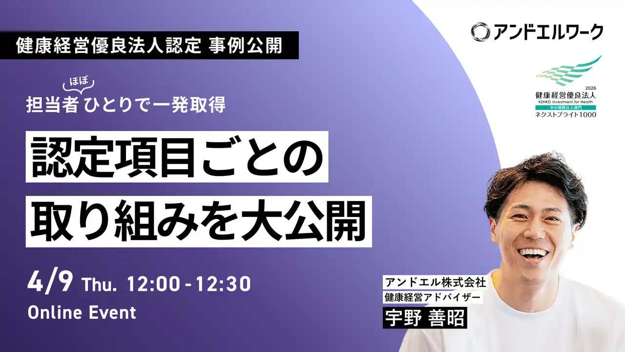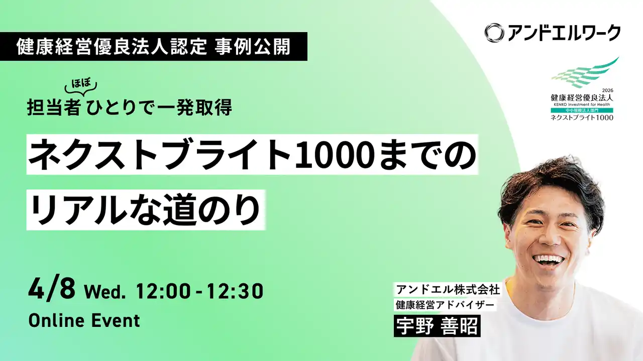 アンドエル株式会社(本社:東京都港区、代表取締役:古橋 智史)は、健康経営優良法人2026(中小規模法人部門)ネクストブライト1000の認定を初回申請で一発取得した実体験を公開するセミナーを、2026年4月8日(水)・9日(木)の2回にわたり無料開催いたします。 |
