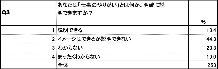 問3においてやりがいについて説明できるか質問したところ、「はっきりと説明できる」とした学生は13.4%に留まりました。もっとも多かった回答は「イメージはできるが説明できない」で44.3%でした。 |