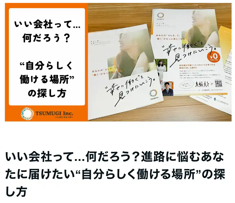 葬祭業にむけ人事コンサルティングや広報支援といったサービスを通して企業様が“いい会社”となるサポートを行っている、つむぎ株式会社(本社:東京都、代表取締役:前田亮)(以下・つむぎ)は就職活動を控える大学生に向け、やりがいのある働き方を伝えるため、【“働く”がちょっと楽しみになるZINE『“幸せに働く”を、見つけにいこう。』】を発行しました。 |