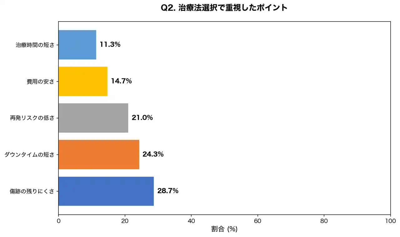 | 傷跡とダウンタイムを合わせると半数以上が「治療後の日常生活への影響」を重視していることがわかります。特に20~30代女性では傷跡への関心が高く、40代以上では再発リスクを重視する傾向が見られました。 | ||||||||||||||||||||||||