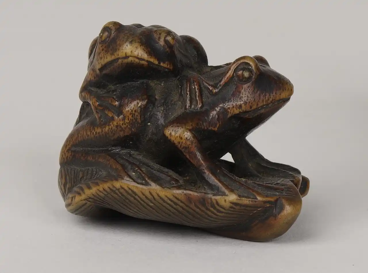 芭蕉の葉の上に2匹の蛙が乗っています。おそらく親子の蛙と見え、上に乗る蛙は下の蛙に甘えてしがみつくようです。蛙の表面のざらざらした質感まで丁寧にあらわされています。 |