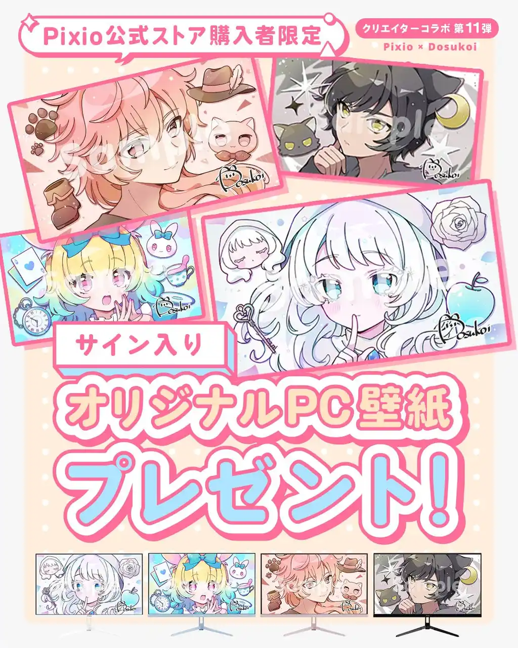 | 第11弾コラボレーションとして、人気のイラストレーター・どす恋氏による描き下ろしイラストを、Pixio「PX275 Wave (全4色)」のイメージビジュアルとして採用しました。 | ||||||||||||||||||||